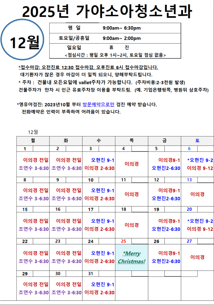 2025년 12월 진료일정 Post Author:가야소아과 Post published:2025-11-30 Post Category:공지사항 You Might Also Like 2018년 무료 독감 사업 안내 2018-10-03 6/15 부터 수요일 전일진료 시작 2016-05-31 2024년 9월 진료일정 2024-09-01