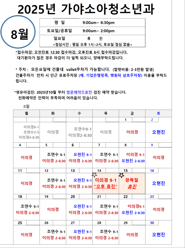 2025년 8월 진료일정 Post Author:가야소아과 Post published:2025-07-29 Post Category:공지사항 You Might Also Like 2025년 3월 진료일정(수정) 2025-02-21 2021년 어린이 4가 무료독감 2021-10-01 아토피환자 여름철 피부관리 2016-08-14